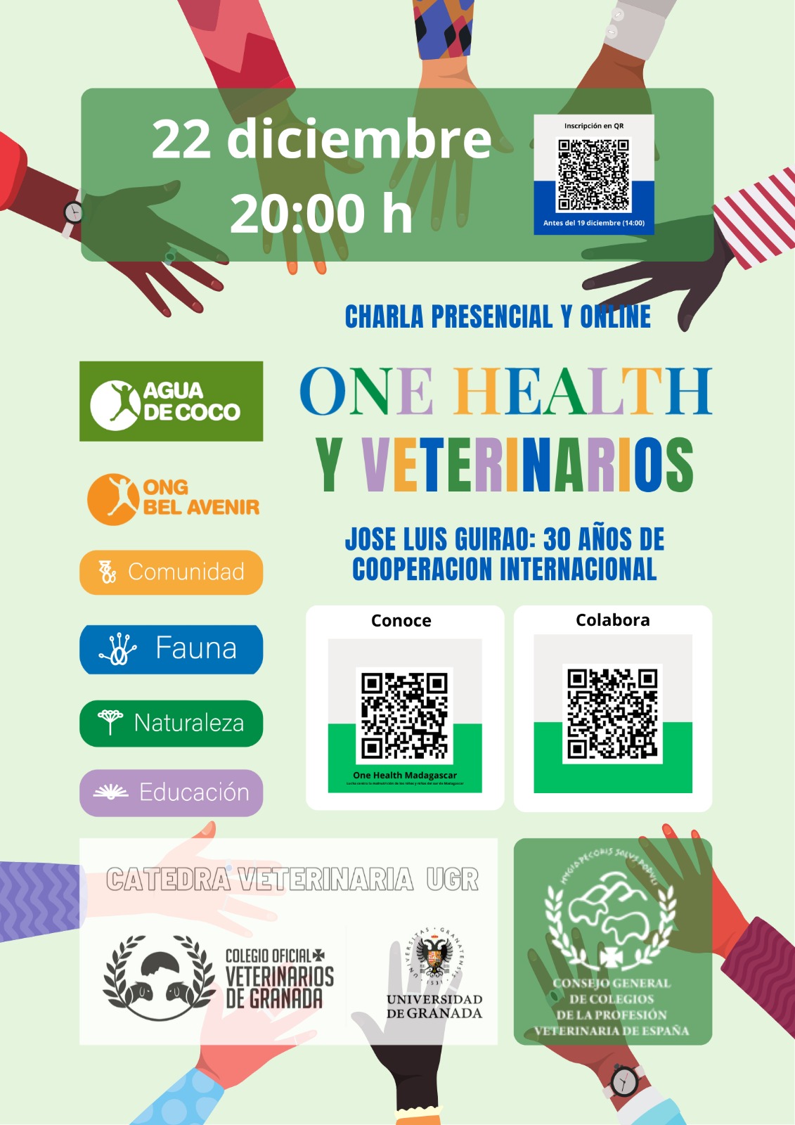 Aprofitant la presència a Espanya de José Luis Guirao, fundador de l'ONG Aigua de Coco el Col·legi de Veterinaris de Granada, organitza, en col·laboració amb la Càtedra Veterinària UGR i el Consell General de la Professió Veterinària d'Espanya, la xerrada “One Health i Veterinaris. José Luis Guirao 30 anys de cooperació internacional”